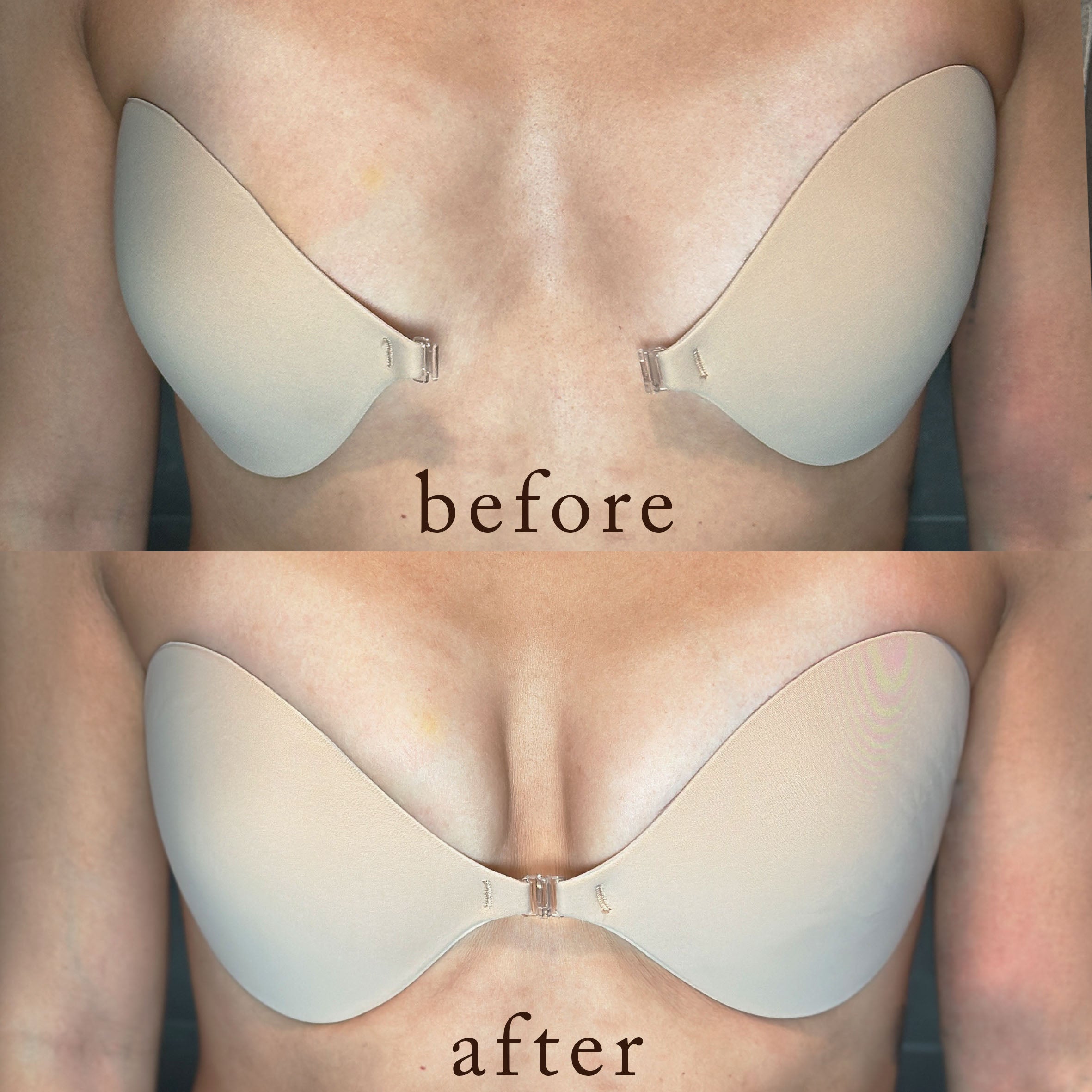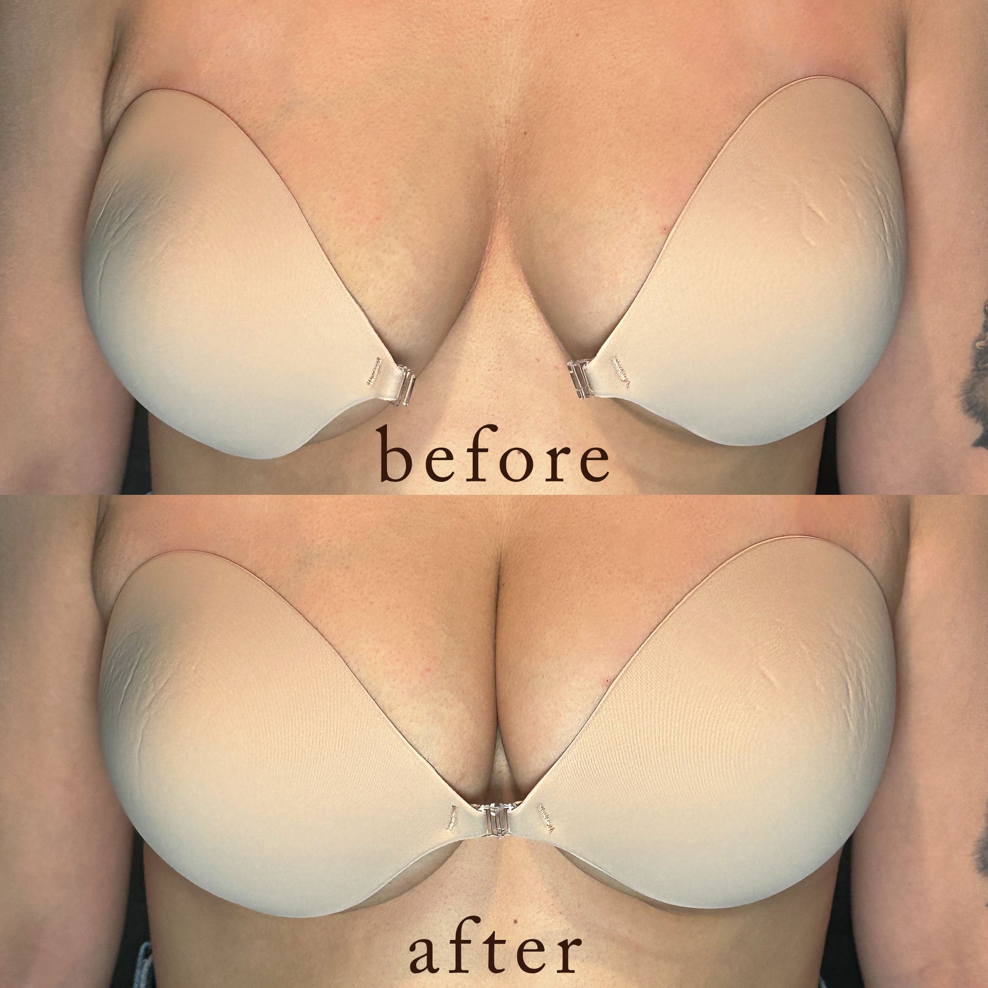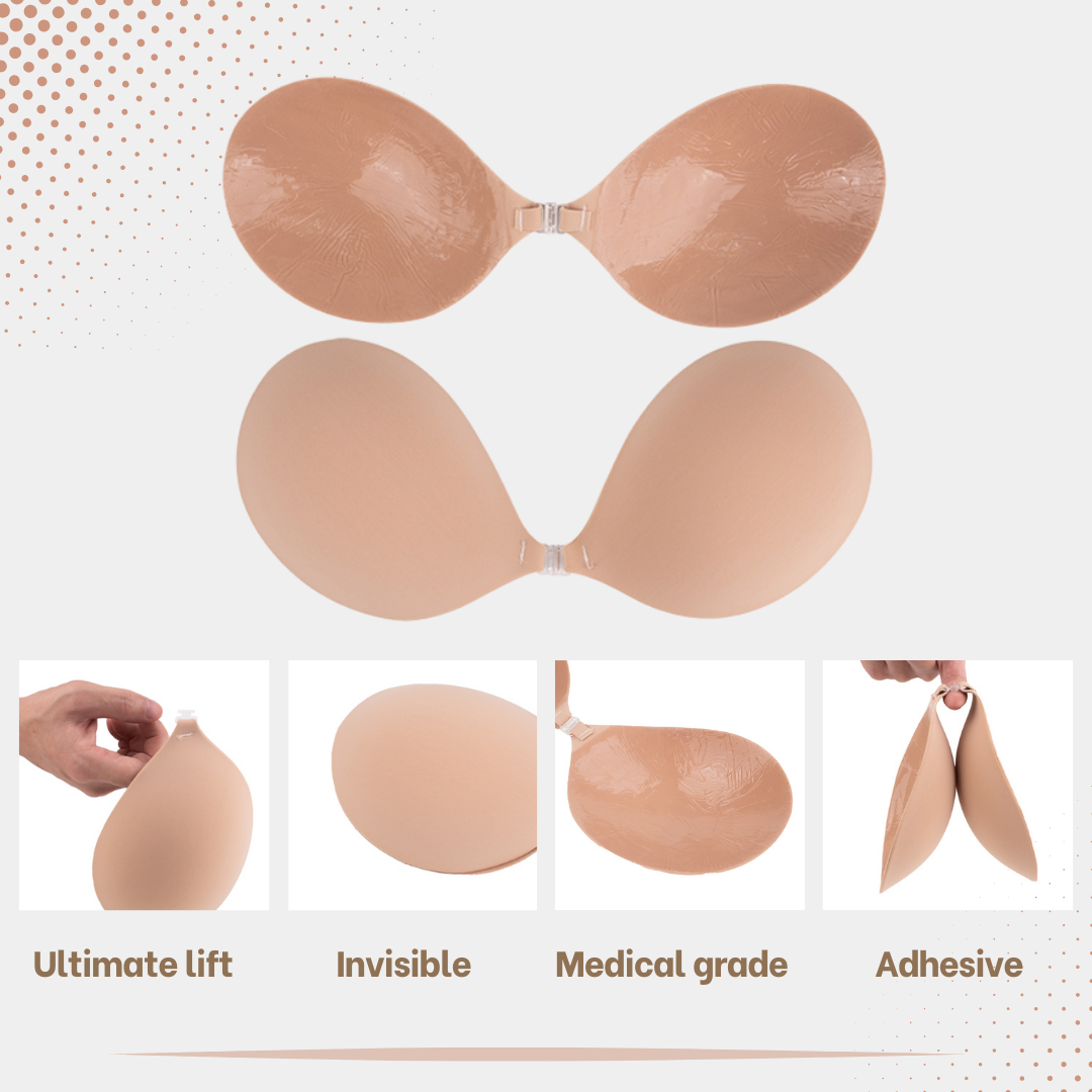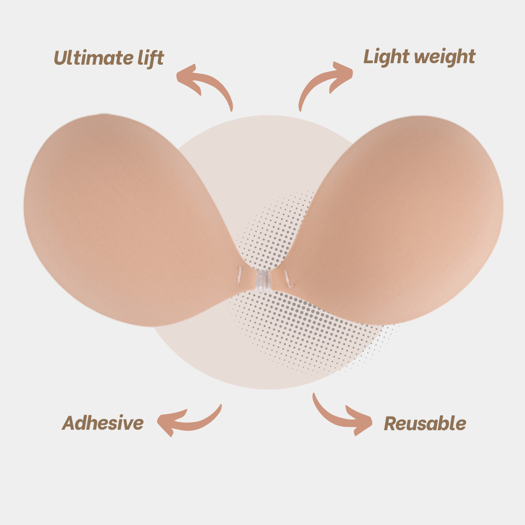 Clean and dry your skin, position the bra, press gently to secure it in place, and lift to achieve your desired cleavage.