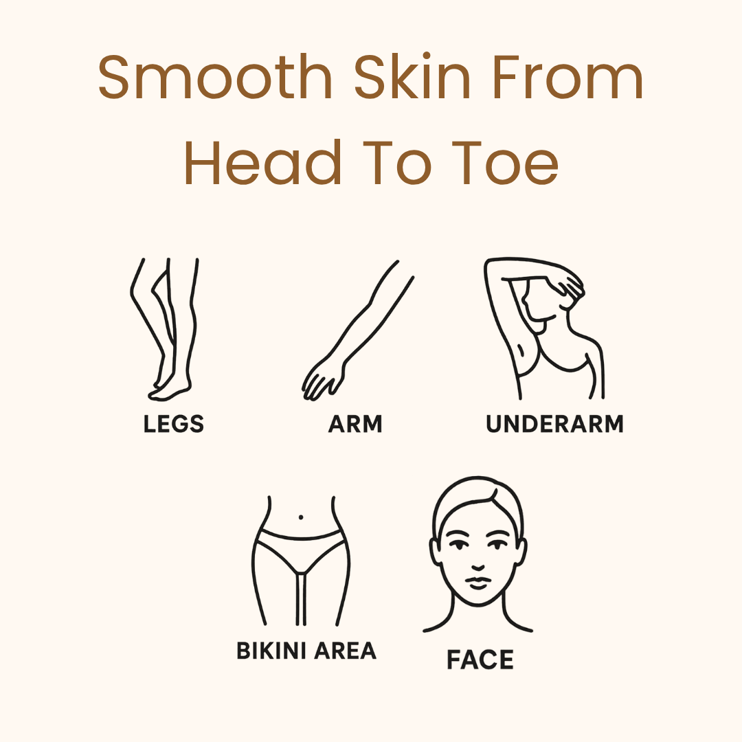 It is safe to use on legs, arms, underarms, the face, and even the bikini area.